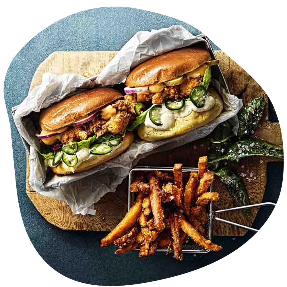 Krispig på utsidan och saftig på insidan! Kallas ofta ”fried chicken sandwich” eller ”fried chicken sando”. Det finns olika stilar som exempelvis ”Kentucky fried” där kycklingen marineras i buttermilk och kryddor som vitlökspulver, lökpulver, och cayenne.