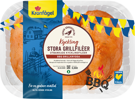 BBQ Stora grillfiléer med grillkrydda från Kronfågel är utbankade kycklingfiléer marinerade i en mustig grillkrydda med smak av bland annat paprika, chili och lök. En större och saftigare filé som passar hela familjen. Grillfiléerna lämpar sig perfekt till att steka eller grilla. Servera gärna med en kall potatissallad. Alltid svensk kyckling för en godare måltid.