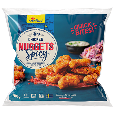 Våra underbart goda svenska Chicken Nuggets Spicy med sting är en storfavorit hos både vuxna och barn. Det som gör denna kycklingnugget unik är paneringen med chili och persilja som blir perfekt krispig efter tillagning. Variera i en caesarsallad, en wrap eller på en nachotallrik. En riktigt bra kycklingnugget som passar med alla tillbehör. Alltid svensk kyckling för en godare måltid.