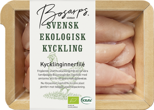 Ekologisk kycklinginnerfilé från Kronfågel är en riktigt mör del av kycklingen. Med sin goda smak passar de, skurna i små munsbitar, perfekt i wokpannan eller uppträdda på ett härligt kycklingspett färdigt att lägga på grillen. Kycklinginnerfilén tillagas snabbt och enkelt för att serveras med fräscha grönsaker och varierande tillbehör. Bosarpkyckling® är ekologisk kyckling uppfödd med KRAV-märkt foder på våra småskaliga, svenska gårdar, som eftersträvar den naturliga utomhusmiljön för djuren.