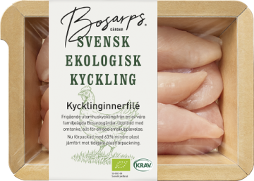 Ekologisk kycklinginnerfilé från Kronfågel är en riktigt mör del av kycklingen. Med sin goda smak passar de, skurna i små munsbitar, perfekt i wokpannan eller uppträdda på ett härligt kycklingspett färdigt att lägga på grillen. Kycklinginnerfilén tillagas snabbt och enkelt för att serveras med fräscha grönsaker och varierande tillbehör. Bosarpkyckling® är ekologisk kyckling uppfödd med KRAV-märkt foder på våra småskaliga, svenska gårdar, som eftersträvar den naturliga utomhusmiljön för djuren.