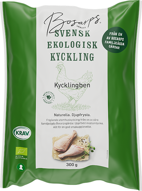 Svenska ekologiska Kycklingben från Bosarp finns i frysdisken. Krydda gärna efter egen smak. När kycklingen håller en innertemperatur på +82°C vid benet är kycklingen klar, saftig och god.
