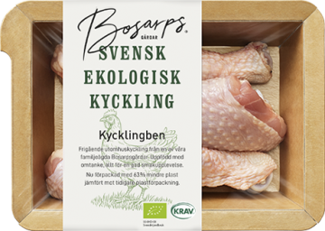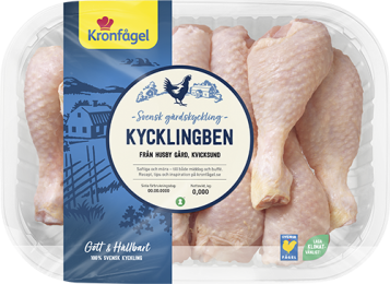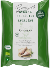 Svenska ekologiska Kycklingben från Bosarp finns i frysdisken. Krydda gärna efter egen smak. När kycklingen håller en innertemperatur på +82°C vid benet är kycklingen klar, saftig och god.