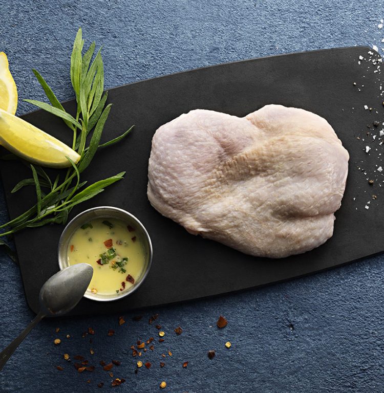 Steka i panna eller stekbord/ugn: Bryn kycklingen på stekbord med skinnet nedåt i ca 6 min. Skinnet ska vara krispigt. Vänd och stek ca 1 min på köttsidan. Efterstek i kombiugn på 150°C i ca 10 min.