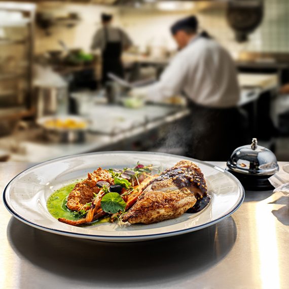 Krispig kycklinglårfilé i varm svampbuljong, svampmajonnäs och dragon