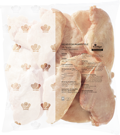 Delad kycklingbröstfilé 87%, vatten, salt. 140–160 g/st.
