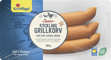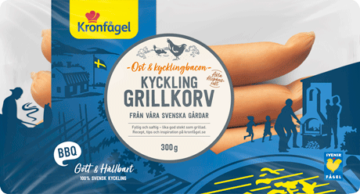 Skinnfri kycklinggrillkorv som innehåller 64% svenskt kycklingkött. Mild i smaken och perfekt för barnen!