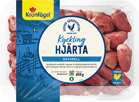 Kycklinghjärtan från Kronfågel passar utmärkt till mustiga grytor med äpple, rödlök, grädde och potatispuré. De är även en god bas i en pastasås. Kycklinghjärta är en smakrik del av kycklingen som passar till lunch och middag alla dagar i veckan. Alltid svensk kyckling för en godare måltid.