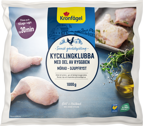 Stor förpackning med fryst, mörad svensk kycklingklubba. Perfekt att grilla eller ugnsbaka och servera med en matig sallad till middag när man är många. Både hälsosamt, miljövänligt och gott.