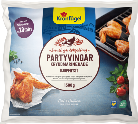 Styckfrysta kryddmarinerade kycklingvingar färdiga att grilla eller steka i ugn. Partyvingar är läckra att servera som förrätt, som drinktilltugg eller på buffébordet.