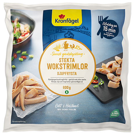 Stekta wokstrimlor av svensk kycklinglårfilé. Perfekt till wok, pasta eller sallad. Färdiga att värma direkt från frysen. I stekpanna ca 5-8 min.