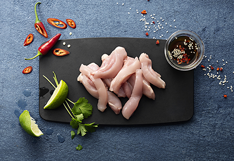 Strimlad kyld, gårdsmärkt lårfilé med strimlingsstorlek 12 mm. Snabbt, bekvämt och lätt! Fettsnål kvalitetsprodukt med ett brett användningsområde. Passar utmärkt till moderna rätter såsom wok, wraps, sallader, taco/tortillas, omelett, paj och pasta.