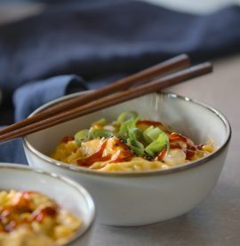 Bibimbap med kyckling och gochujangsås, gurka och kimchi
