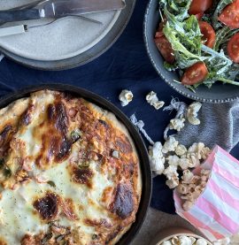 Kycklingfärspaj med getost, tomater, pinjenötter och basilika
