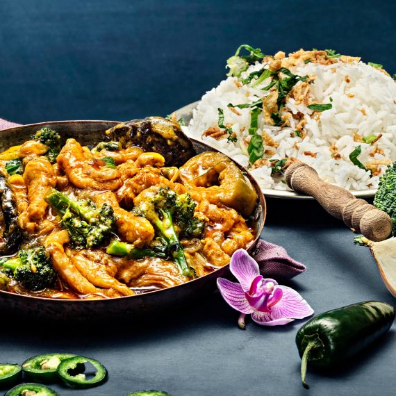 Strimlad kycklinglårfilé Vitlök & Chili med indisk-kryddad potatis