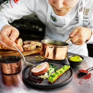 Ballotine med kycklingputs, lökkräm och pistagenötter Med kryddstekt morot, gräddstuvad grönkål, persiljepistou och kycklingsky