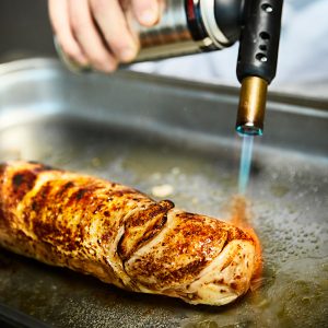 Rulla ihop kycklingen med mousselin i mitten, fixera i plastfilm och baka i ugn på 90°C till innertemperaturen når 68°C. Kyl ned ordentligt i cirka 1 timme. Bränn av rullen med en brännare, strö över lite socker och bränn igen. Toppa med rosépepparskal, timjan och fänkålspollen