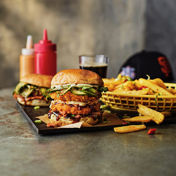Crispy Chicken Burger med kimchi, picklad chili-gurka och Hoisinsås