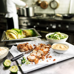 Den smakrika kycklingen serveras med grillad kålsallad, rostade sesamfrön, sojamajonnäs och nykokt ris
