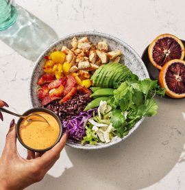 bbq chicken sallad bowl med svart ris, mango, avokado och hot´n´sweet dressing
