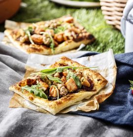 Smördegspizza med kyckling, getost och rödlöksmarmelad