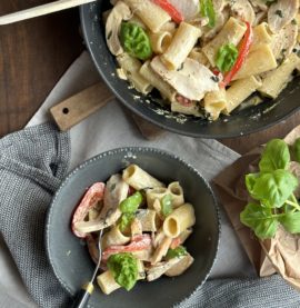 Pasta och tomatsås med hel kyckling och basilikafärskost