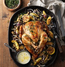 Ugnsgrillad påsk-kyckling med rostad mandelpotatis, champinjoner, citronsky